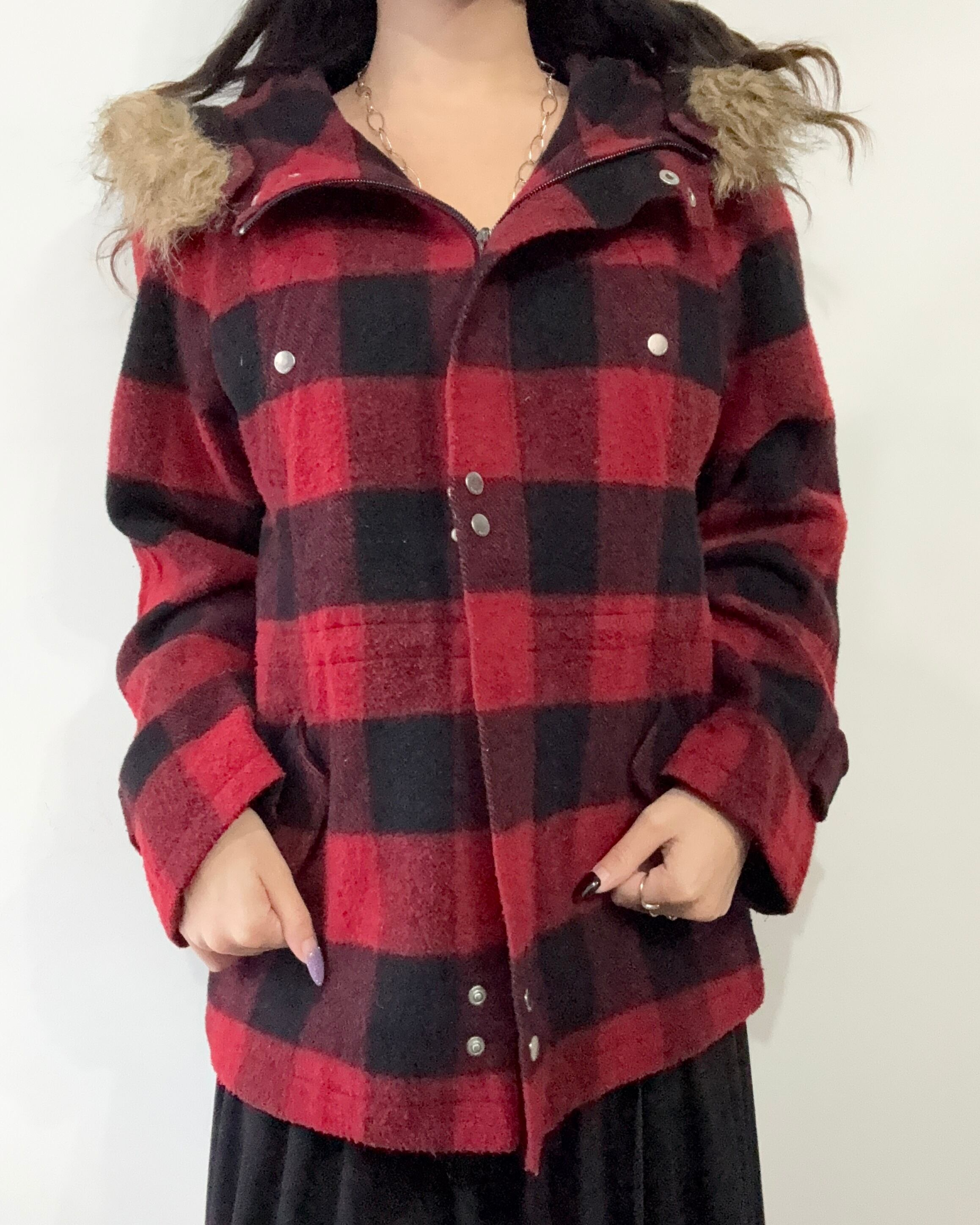 hood fur plaid pattern wool jacket